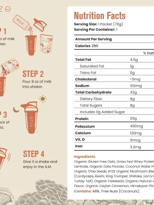 RYZE is naturally sweetened by whole foods, including dates, vanilla, and cinnamon which means zero added sugar while still maintaining a delicious vanilla & cinnamon taste.