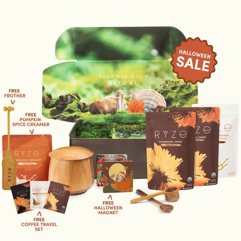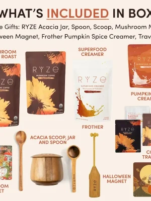Accelerate your results with two cups a day and create your RYZE ritual. Enjoy two cups of Mushroom Coffee a day with our Superfood Creamer for an extra mushroom kick and creamy latte feel. On your first order, you’ll receive a new tablespoon scoop for perfect portioning, a mushroom jar designed to keep your blend fresh, and a spoon for stirring.