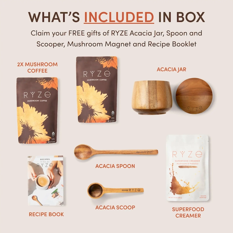 Accelerate your results with two cups a day and create your RYZE ritual. Enjoy two cups of mushroom coffee a day with our superfood creamer for an extra mushroom kick and creamy latte feel. On your first order, you’ll receive a new tablespoon scoop for perfect portioning, a mushroom jar designed to keep your blend fresh, and a spoon for stirring.
