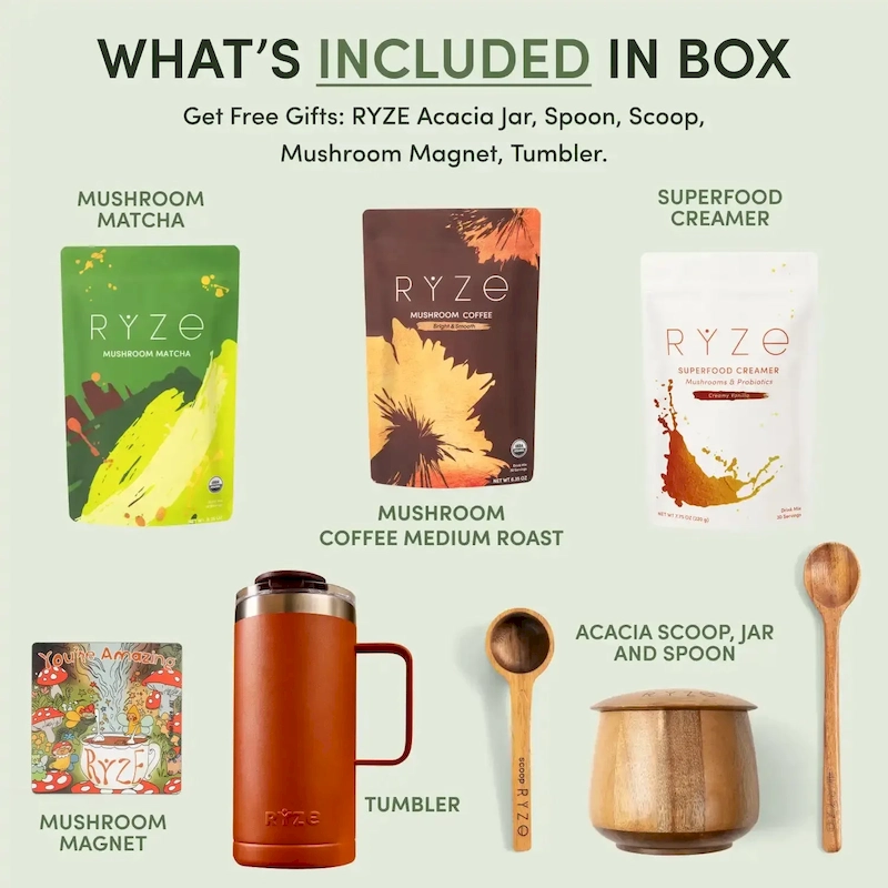 Accelerate your results with two cups a day and create your RYZE ritual. Enjoy two cups of mushroom coffee a day with our superfood creamer for an extra mushroom kick and creamy latte feel. On your first order, you’ll receive a new tablespoon scoop for perfect portioning, a mushroom jar designed to keep your blend fresh, and a spoon for stirring.