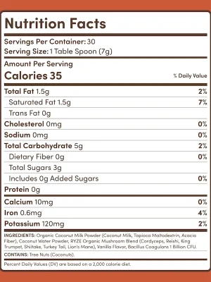 Meet mushroom coffee’s silky-smooth soulmate. We re-crafted the traditional coffee creamer as a vegan, coconut vanilla dream that tastes like creamy indulgence but mirrors all the added benefits of our organic mushroom-blend: 100% organic mushrooms, cognitive enhancing fats, hydrating coconut, added probiotics for gut support and improved digestion. The best part – absolutely no sugar.